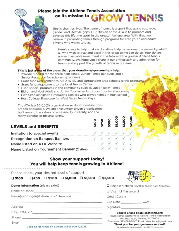 Interested individuals can review the complete details in the attached document. Please let us know if you have questions by emailing the Abilene Tennis Association (ATA).